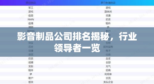 随着科技的飞速发展和全球化的推进,影音制品行业持续繁荣,竞争也日益激烈,在这个行业中,一些影音制品公司凭借其卓越的表现和创新能力脱颖而出,成为行业的佼佼者,本文将为您揭示当前影音制品公司的排名,带您了解这些行业的领导者。
