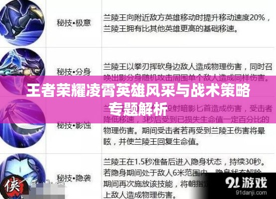 凌霄作为《王者荣耀》中的一位英雄,凭借其高机动性、远程攻击与控制技能,在游戏中展现出独特的魅力,通过本文的介绍,希望玩家能更好地了解凌霄的英雄风采与战术策略,提高游戏水平。