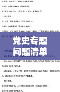 党史专题问题清单是对中国共产党历史进行深入研究和梳理的重要手段,通过对党史中的重大事件、重要人物、核心思想等进行系统梳理和反思,我们可以更好地认识党的光辉历程,总结历史经验,为新时代的发展提供借鉴和启示,本文将围绕党史专题问题清单展开研究,探讨其生成背景、主要内容及意义。