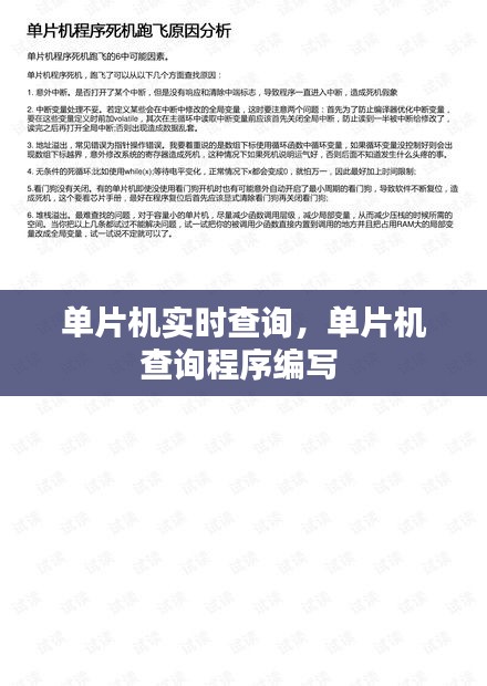 单片机实时查询是现代电子系统中不可或缺的一部分。通过实时监测和控制,单片机能够提高系统的响应速度和稳定性,为各种应用场景提供高效、可靠的解决方案。随着技术的不断发展,单片机实时查询的性能和可靠性将得到进一步提升,为未来的智能设备和系统发展奠定坚实基础。