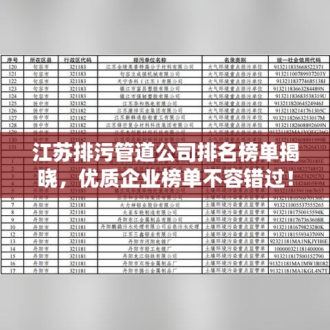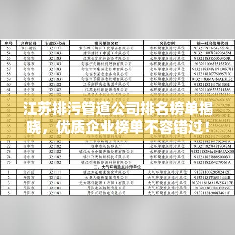 随着城市化进程的加速,排污管道系统的建设与管理变得日益重要,在江苏省,众多排污管道公司如雨后春笋般涌现,为城市的环保建设贡献力量,本文将为您介绍江苏排污管道公司的排名榜,以便您了解这些公司的实力与影响力。